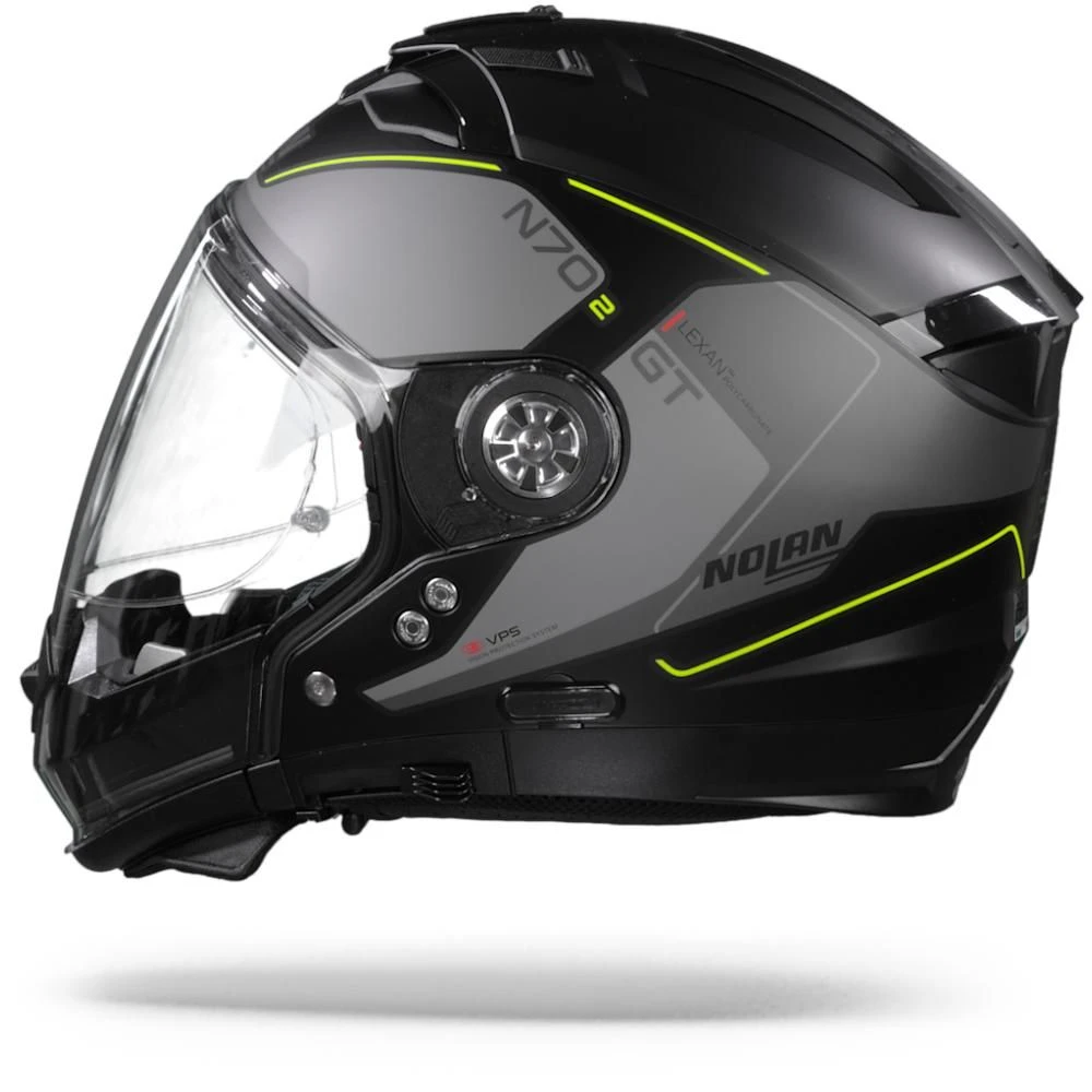 De N70-2 GT is een verbeterde crossover versie van de serie N44. Deze nieuwe Nolan-serie levert een zeer aanpasbaar product, en dat is iets wat we leuk vinden! Het biedt de mogelijkheid om uw helm aan te passen aan uw rijgedrag en type reis, want zes verschillende helmconfiguraties zorgen inderdaad voor veel flexibiliteit! Veel plezier bij het puzzelen met 2 uitneembare elementen: vizier en beschermende kinbeschermer, en creëer de combinatie die u wenst. Alle combinaties zijn zorgvuldig getest door Nolan en zijn P/J gehomologeerd. En mocht dit u nog niet overtuigen, dan is de N70-2 GT ook uitgerust met een ultrabreed vizier (Pinlock inbegrepen) en een LEXAN TM zonnevizier dat zowel kras- als mistbestendig is, alsook instelbaar en afneembaar, zodat u optimaal zicht heeft tijdens zonnige rij-uren.